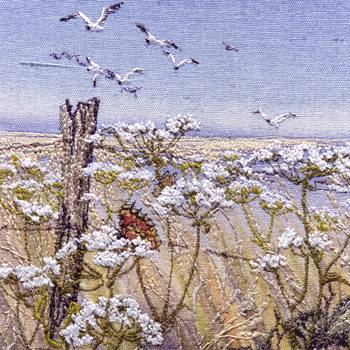 The centrepiece of these printed cards have been derived from Thread Paintings®' originals embroidered onto silk by Pauline Thomas, who reserves the copyright.